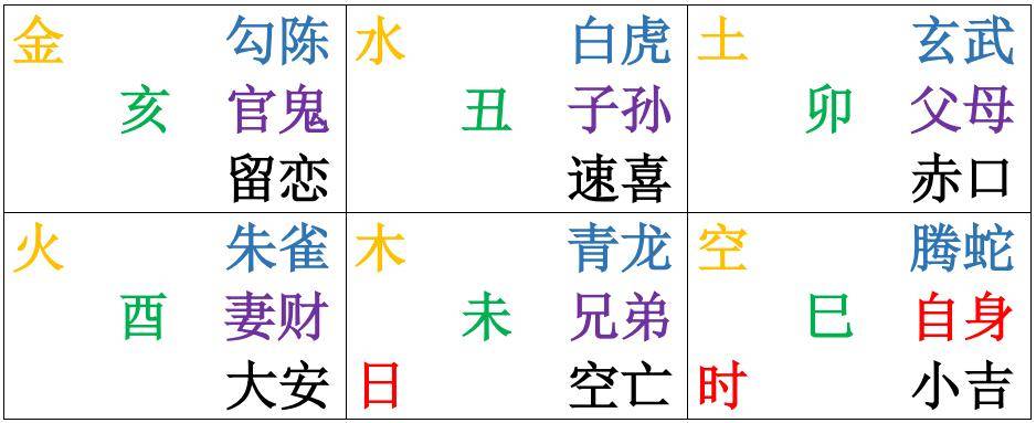 生我者为父母,克我者为官鬼,我生者为子孙,我克者为妻财,与我同类者为兄弟。具体为什么是按照这个逻辑来排,下一篇文章会详细讲解。如果对十二地支五行所属等知识还不了解,请参看江阳君的《江氏小六壬教程4:十二地支含义属性等基础知识详解》一文。当然,理论看起来没那么好理解,所以咱们下面还是来举例说明一下,咱们还是接着上文的例子,以张三同志为例: