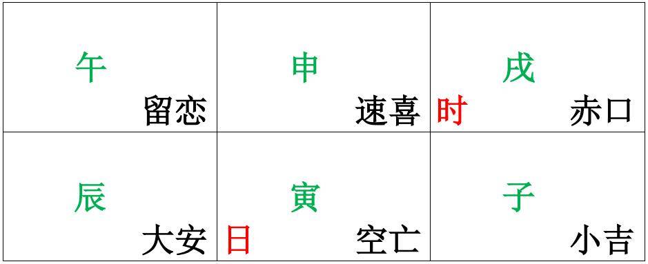 则此课地支排列为:赤口戌、小吉子、空亡寅、大安辰、留恋午、速喜申,如下图所示。