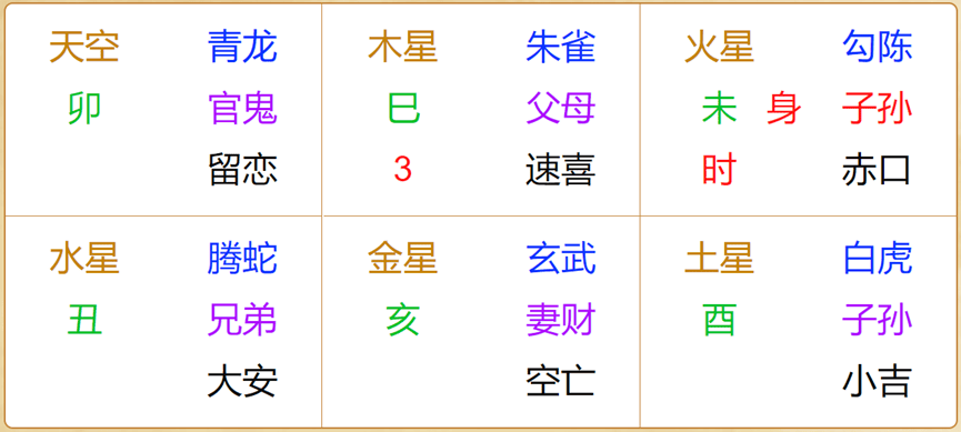 第三步、装六亲。六亲是按照地支生克关系来的,自身未土生小吉宫酉金,小吉宫为子孙;自身未土克空亡宫亥水,空亡宫为妻财;自身未土与大安宫丑土相同,所以大安为兄弟;留恋宫卯木克自身未土,留恋宫为官鬼;速喜宫巳火生自身未土,速喜宫为父母。