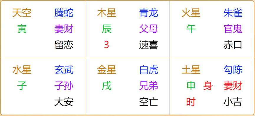 第三步、装六亲。六亲是按照地支生克关系来的:空亡宫为兄弟;自身申金生大安宫子水,大安为子孙;自身申金克留恋宫寅木,留恋宫为妻财;速喜宫辰土生自身申金,速喜宫为父母;赤口宫午火克自身申金,赤口宫为官鬼,