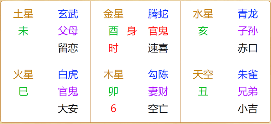 第五步、装五星。起五星比较简单,以数字落宫为准开始顺起木、火、土、金、水、空,本卦数字落空亡为木星,大安为火星,留恋为土星,速喜为金星、赤口为水星、小吉为天空。