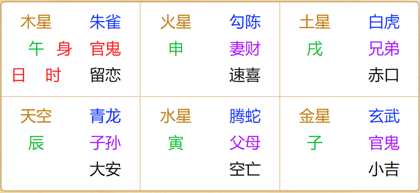 第三步、装六亲。六亲是按照地支生克关系来的,具体为:自身午火克速喜宫申金,我克者为妻财,速喜宫为妻财;赤口宫戌土为兄弟;小吉宫子水克自身午火,克我者为官鬼,小吉宫为官鬼;空亡宫寅木生自身午火,生我者为父母,空亡宫为父母。自身午火生大安宫辰土,我生者为子孙,大安宫为子孙;