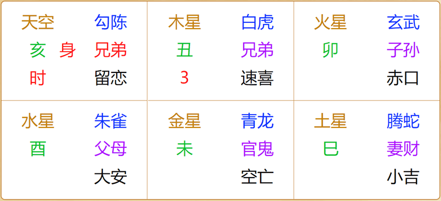 第四步、装六神。巳亥空亡起青龙,当自身地支为巳或亥时,从空亡宫开始起青龙。然后从空亡顺时针往下排,具体为:大安宫为朱雀、留恋宫为勾陈、速喜宫为白虎、赤口宫为玄武、小吉宫为腾蛇。