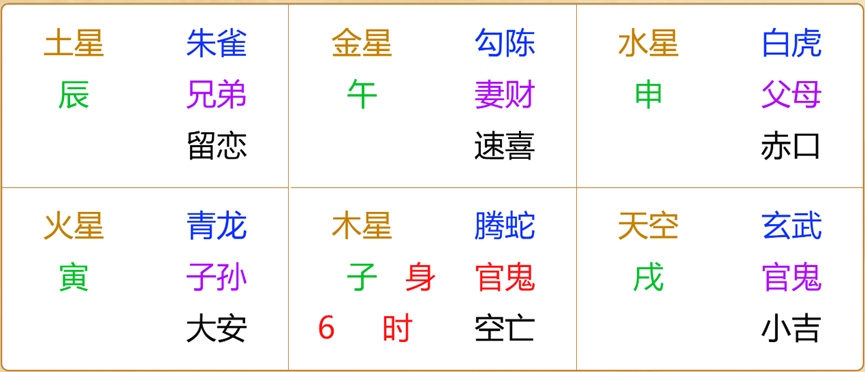 第五步、装五星。五星以数字所落的宫为准,按照顺时针顺序为木、火、土、金、水、天空来排列,本卦的数字是落在空亡,空亡为木星,按照顺时针排列:大安为火星,留恋为土星,速喜为金星、赤口为水星、小吉为天空。