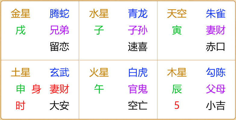 起卦时间,15点16分,起卦方式,数字起卦,报的数字是5。按照江氏小六壬的起卦排盘规则,此卦装完之后如下: