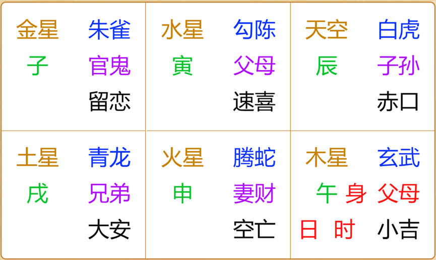 根据江氏小六壬的起卦方式和规则,此卦装完之后如下: