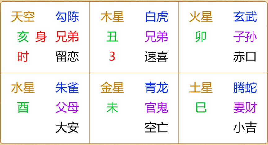 卦主的起卦方式是数字起卦,报数3,起卦时间是半夜22点多,也就是亥时。根据江氏小六壬的起卦方式和规则,此卦装完之后如下: