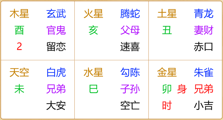 卦主的起卦方式是数字起卦,报数14,起卦时间是早上6点多,也就是卯时。根据江氏小六壬的起卦方式和规则,此卦装完之后如下: